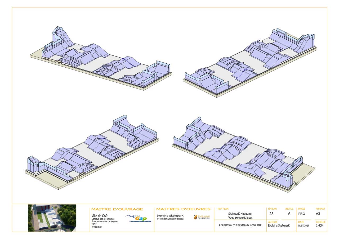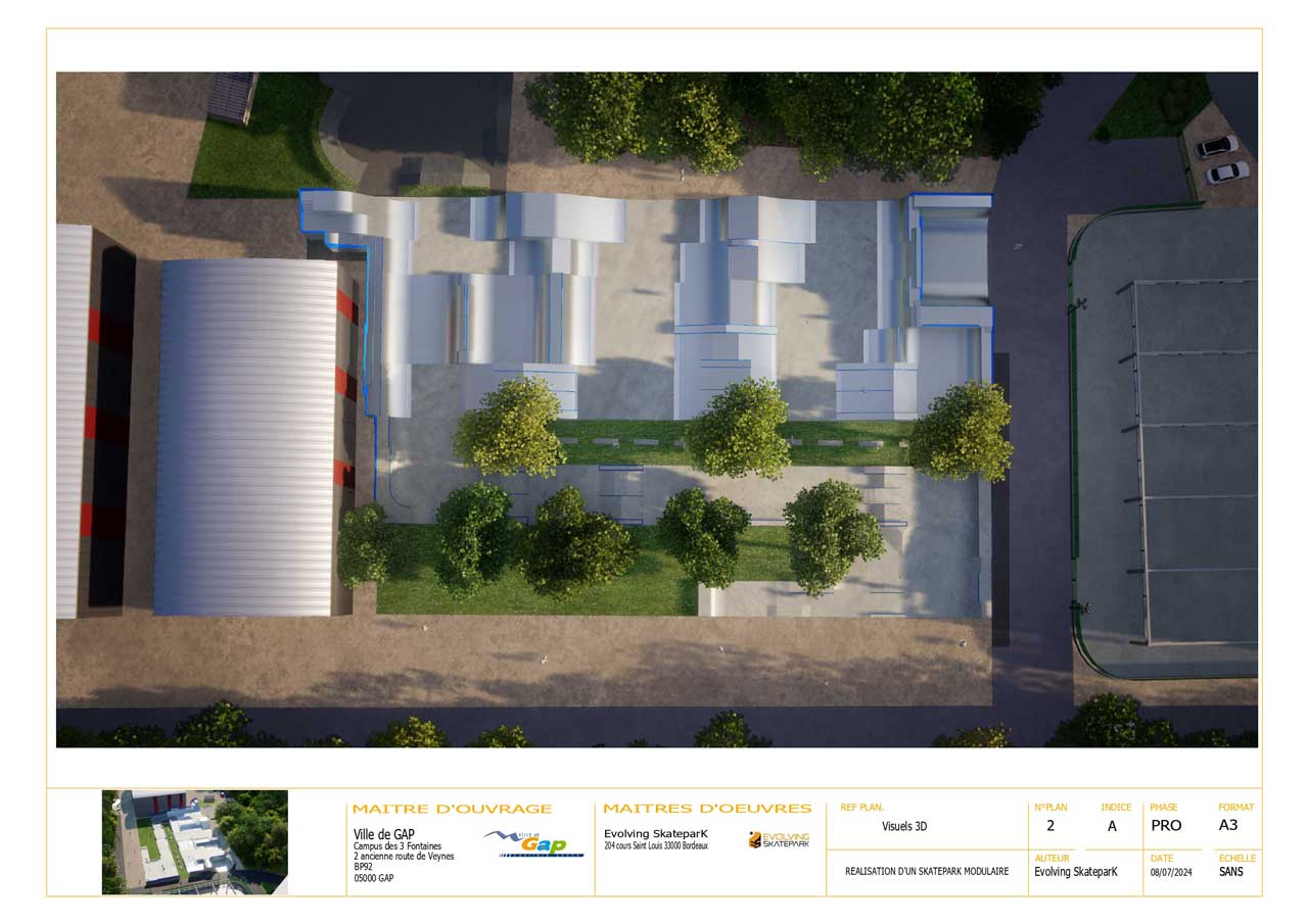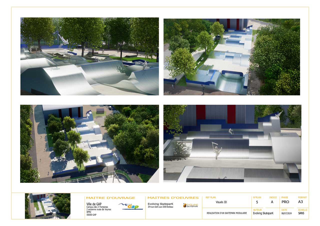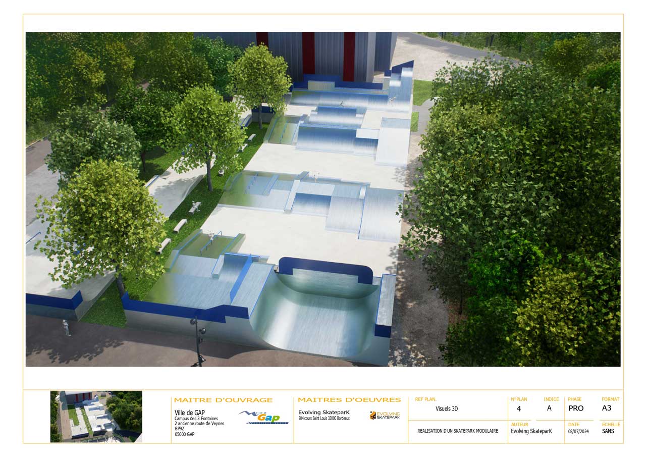 Sur la partie freestyle park, le projet du skatepark Gap s’appuie sur une conceptionréalisée par Roman Abrate et Mathias Wecxsteen.
